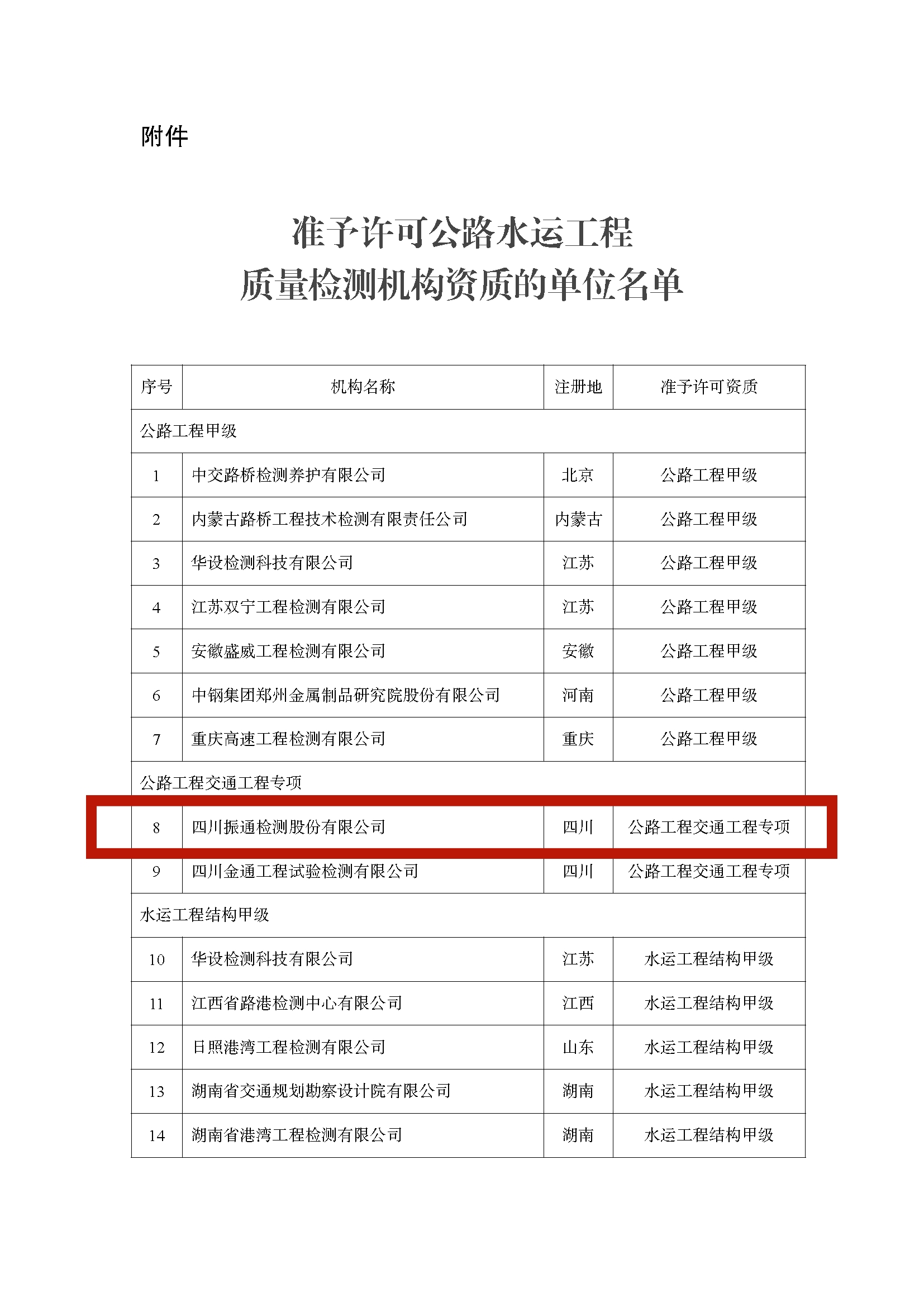近日,交通运输部公布了公路工程质量检测机构资质许可的决定,准予许可四川振通检测股份有限公司交通工程专项资质。这标志着公司成为四川省首家民营公路工程质量检测“一甲两专”全资质的检测机构。